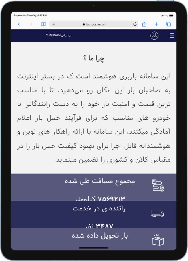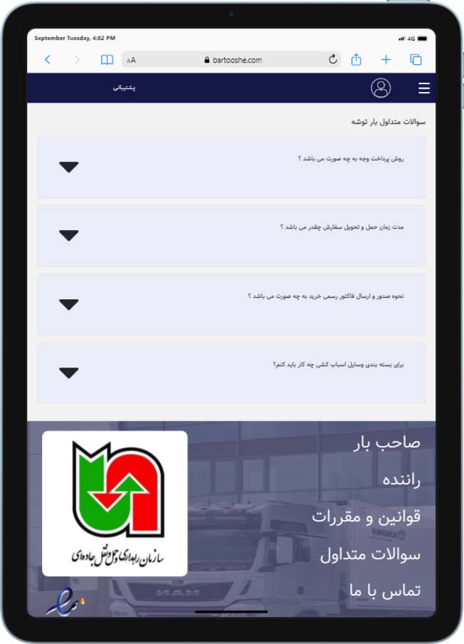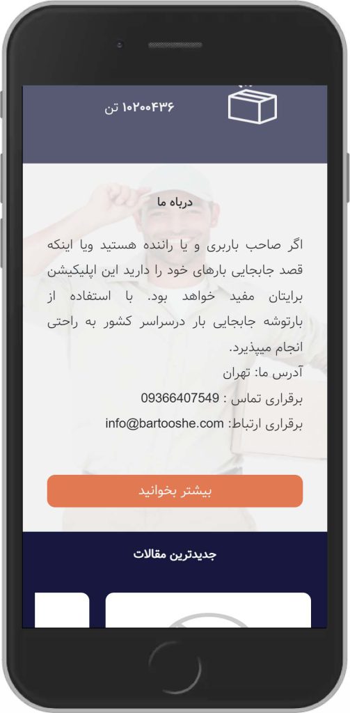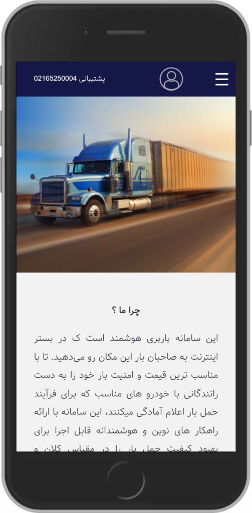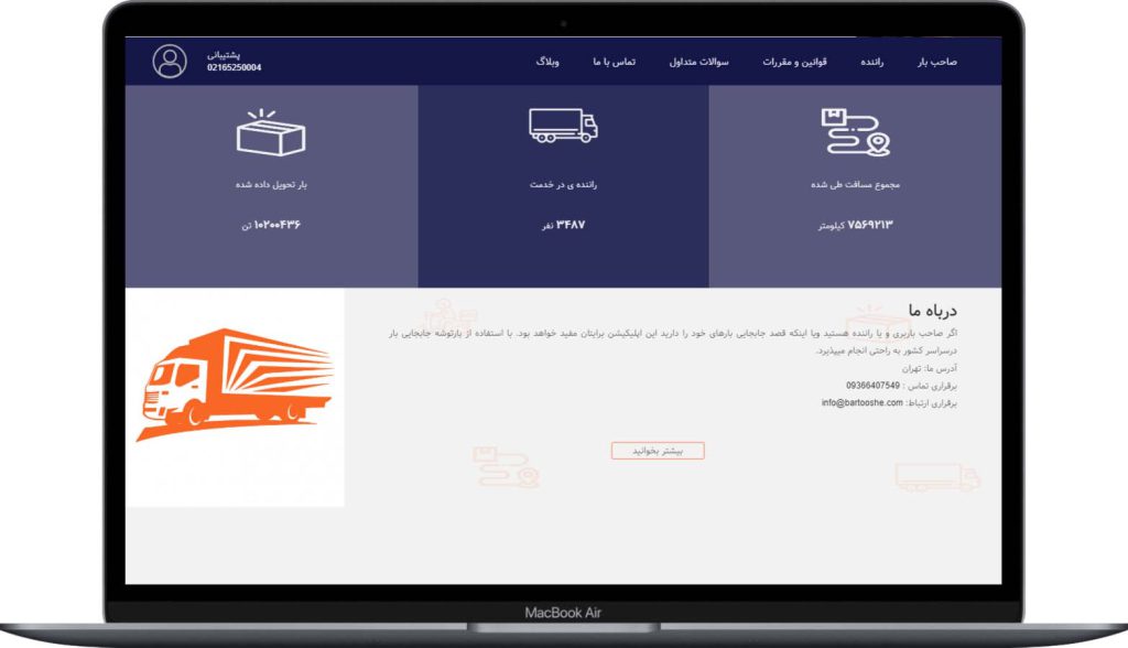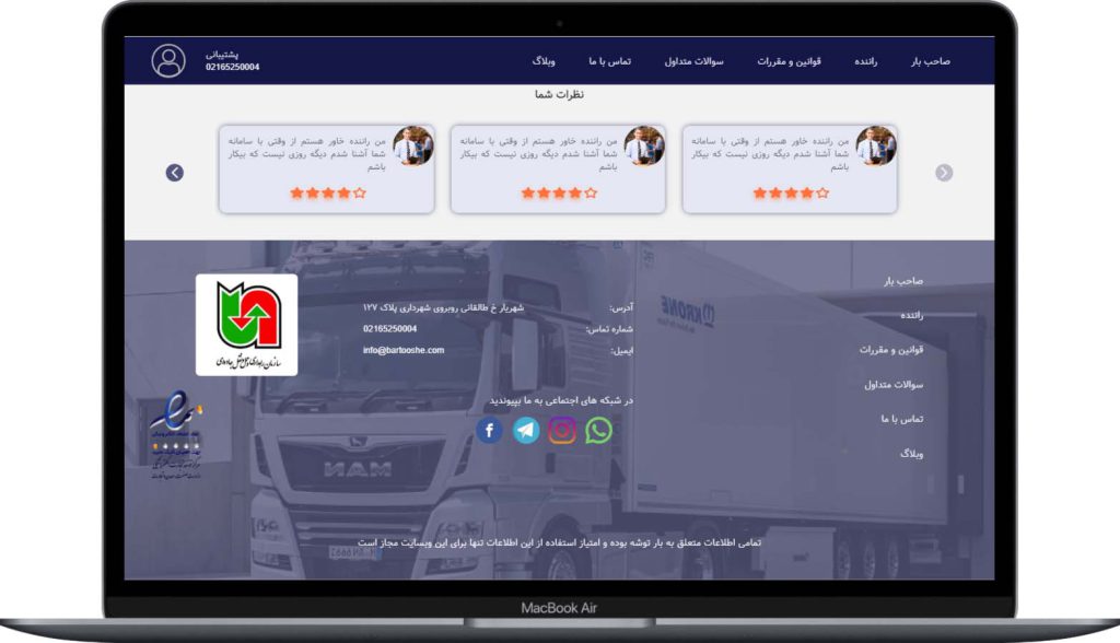 نمونه کار طراحی سایت حمل و نقل بارتوشه که توسط خدمات کسب و کار راحت بین برنامه نویسی شده است.