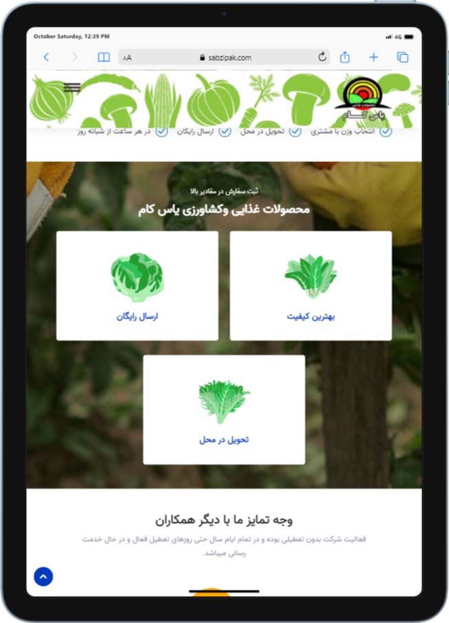 فروشگاه یاس کام، عرضه کننده بدون واسطه انواع سبزیجات به صورت ارگانیک است. این شرکت همه روزه، حتی در روزهای تعطیل نیز مشغول به فعالیت میباشد. سفارشات شما به صورت بهداشتی، ضدعفونی و پاک شده با بهترین کیفیت و ارسال رایگان تحویل میگردد. همکاری طولانی مدت با انواع سازمانهای دولتی و خصوصی به درخشان تر شدن سابقه این شرکت کمک شایانی کرده است.